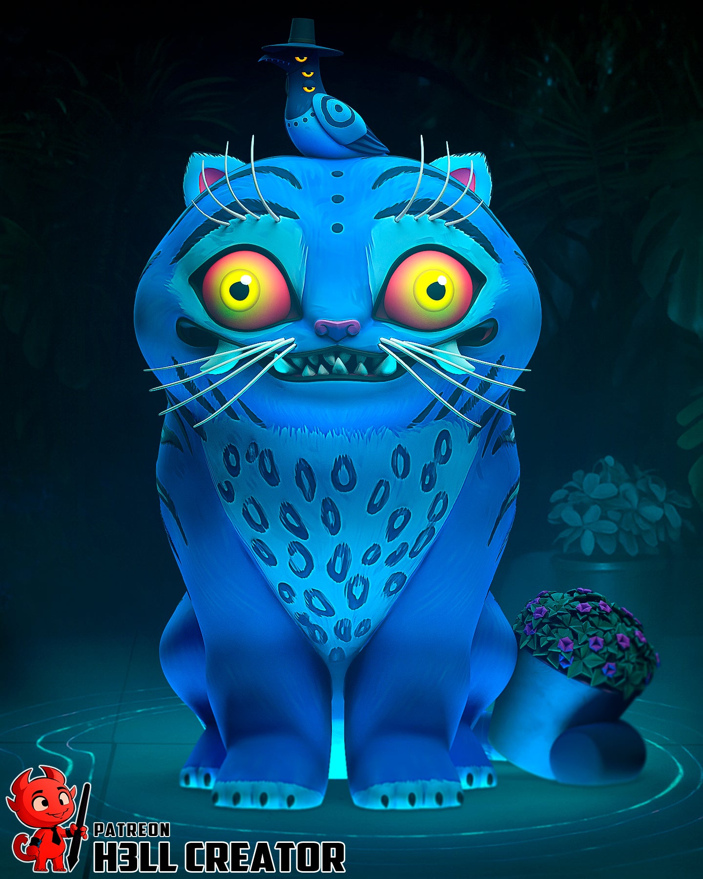 Derpy — a large, supernatural feline with cerulean fur, black stripes, and a ever-grinning set of tusk-like teeth — carries a goofy, loyal heart. He is drawn to upright mis-placed objects and often stumbles into his own heroic moments.