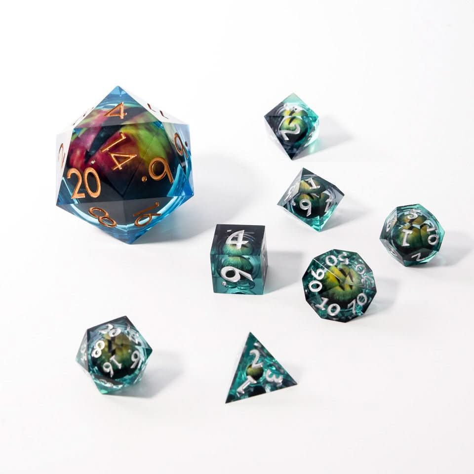 Encased within each die is a floating eyeball, suspended in a layer of frictionless liquid. As the die rolls, the eye twists and turns, always landing to glare ominously upwards. Choose from the malevolent stare of a dragon eye, demon eye, or human eye, each available in a variety of colours to complement your gaming experience.