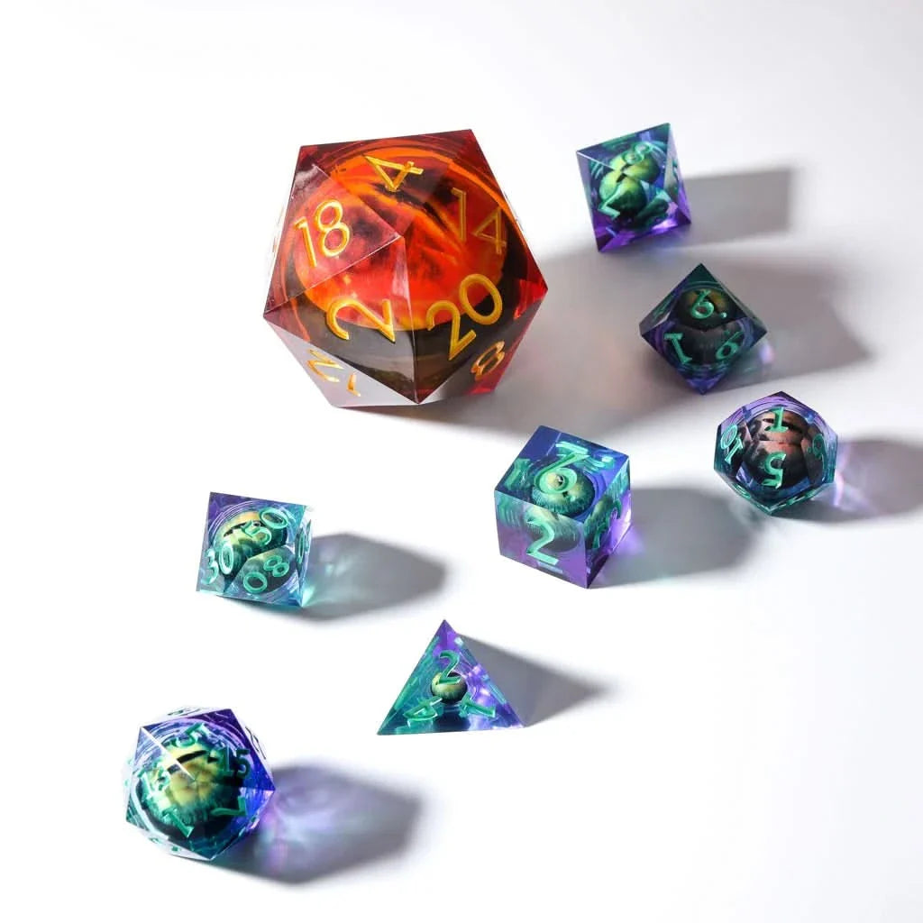 Encased within each die is a floating eyeball, suspended in a layer of frictionless liquid. As the die rolls, the eye twists and turns, always landing to glare ominously upwards. Choose from the malevolent stare of a dragon eye, demon eye, or human eye, each available in a variety of colours to complement your gaming experience.