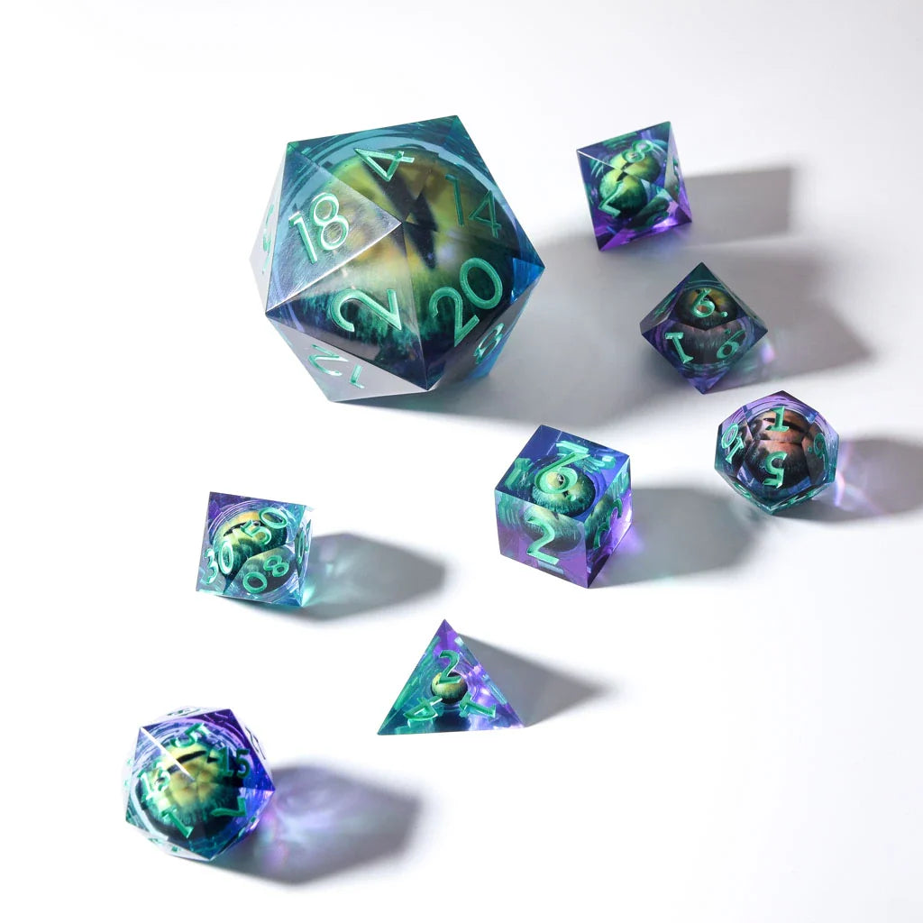 Encased within each die is a floating eyeball, suspended in a layer of frictionless liquid. As the die rolls, the eye twists and turns, always landing to glare ominously upwards. Choose from the malevolent stare of a dragon eye, demon eye, or human eye, each available in a variety of colours to complement your gaming experience.
