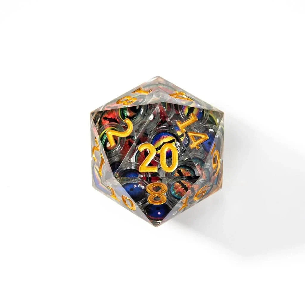 Inside each die lies a myriad of eyeballs, eerily suspended within a frictionless liquid core. As you roll the die, the eyes twist and turn, ultimately glaring ominously upward, watching and waiting. Perfectly themed for the dark and mystical realms of Dungeons and Dragons, this die adds a layer of intrigue and suspense to your gaming sessions.