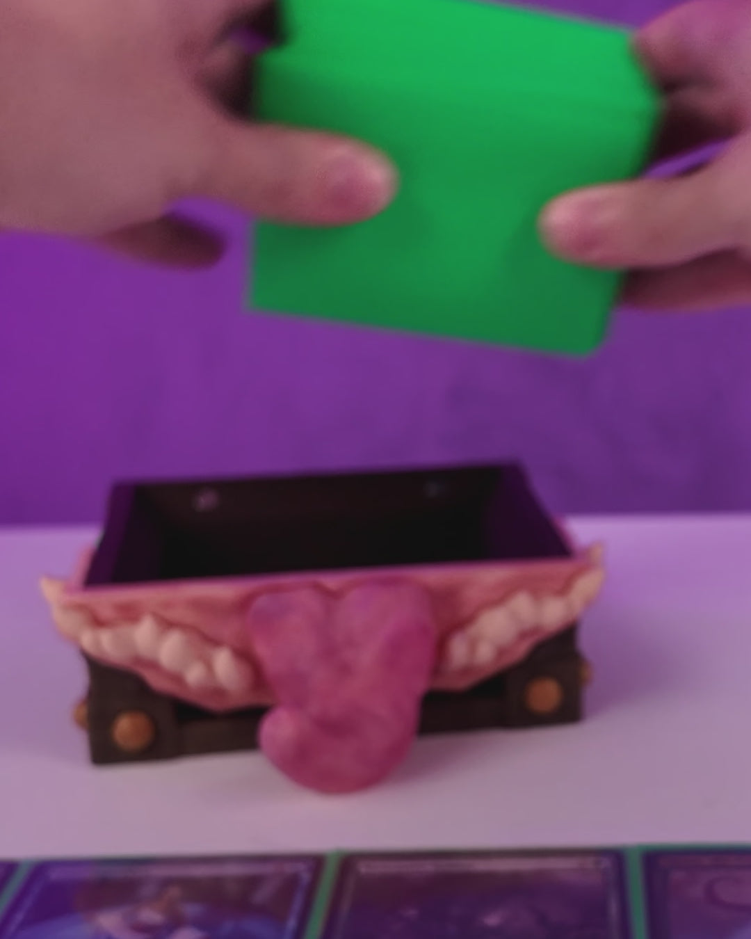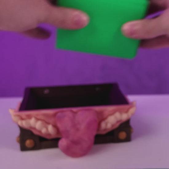 Perfect for bringing humour, danger, and dungeon-delving flavour to your table, this creature-chest keeps your cards safe while looking like it might eat anyone who tries to borrow sleeves.