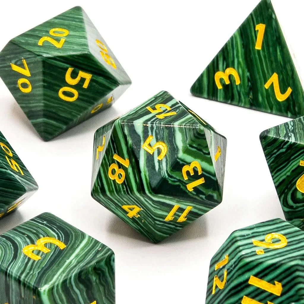 Dive into your Dungeons and Dragons adventures with the Malachite Natural Gemstone Dice set, a collection that beautifully combines the mystical allure of malachite with the strategic depth of role-playing. Known for its striking green colour and unique banded patterns, malachite is a gemstone that enchants with its swirling layers and deep, vibrant hues that echo the verdant realms of enchanted forests and ancient earth magic in DnD.