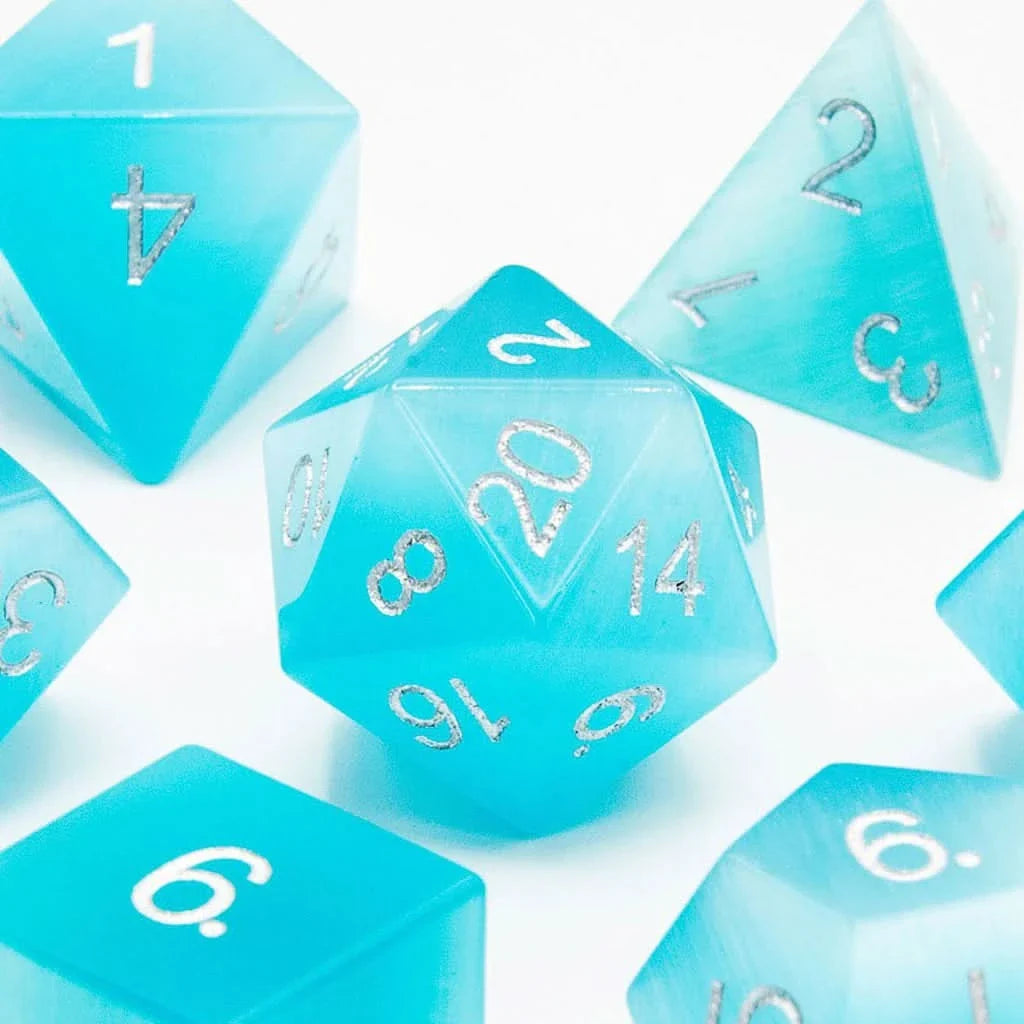 Pale Blue Cat's Eye Natural Gemstone Dice: 7-Piece Set
